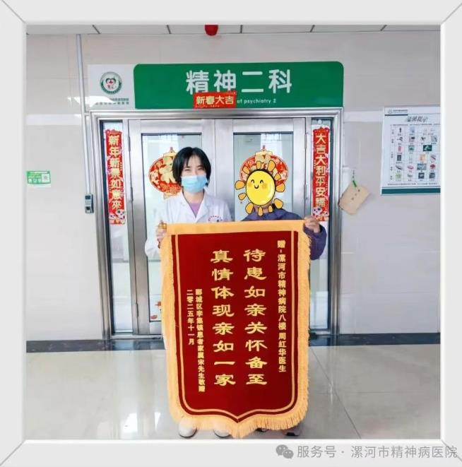 11.7日上午,患者家屬宋先生將寫(xiě)著“待患如親關(guān)懷備至,真情體現(xiàn)親如一家”的錦旗,鄭重交到周紅華醫(yī)生手中。白大褂與便服的身影并肩而立,身后“精神二科”的門(mén)牌旁,還貼著沒(méi)摘下的新春福字,仿佛連舊歲的祝福,都在為這份醫(yī)患溫情作注。