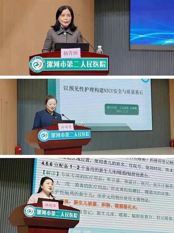 學(xué)術(shù)交流環(huán)節(jié),市中心醫(yī)院NICU護(hù)士長(zhǎng)楊青麗以《新生兒低血糖臨床規(guī)范管理專家共識(shí)》(2021)為題,系統(tǒng)闡述了新生兒低血糖的“預(yù)防、篩查、干預(yù)、隨訪”四個(gè)重點(diǎn);市二院護(hù)理部副主任孫麗霞分享了《以預(yù)見(jiàn)性護(hù)理構(gòu)建NICU安全與質(zhì)量基石》,點(diǎn)明預(yù)見(jiàn)性護(hù)理是NICU生命安全保障的基石,也是質(zhì)量持續(xù)提升的第一道防線;市二院感控辦副主任韓艷軍以《新生兒病區(qū)醫(yī)院感染預(yù)防與控制標(biāo)準(zhǔn)》進(jìn)行了交流,闡明要嚴(yán)守感控標(biāo)準(zhǔn),筑牢安全防線,保障每一位新生兒的健康與安全;市婦幼保健院兒科護(hù)士長(zhǎng)鄭文韜以《高危兒靜脈通路的合理選擇》展開(kāi),講解了高危兒靜脈通路的選擇,核心在于基于個(gè)體評(píng)估,實(shí)現(xiàn)安全與療效的最佳平衡;市二院靜療??谱o(hù)士李艷結(jié)合《兒童靜療常見(jiàn)并發(fā)癥的預(yù)防及處理》,提出兒童靜療安全,核心在于以預(yù)防為首;市二院傷口造口??谱o(hù)士馬美華分享了《兒童常見(jiàn)皮膚護(hù)理與管理》,闡述嚴(yán)守預(yù)防底線,踐行精細(xì)照護(hù),是守護(hù)新生兒稚嫩肌膚、避免醫(yī)源性皮膚損傷的根本之道。