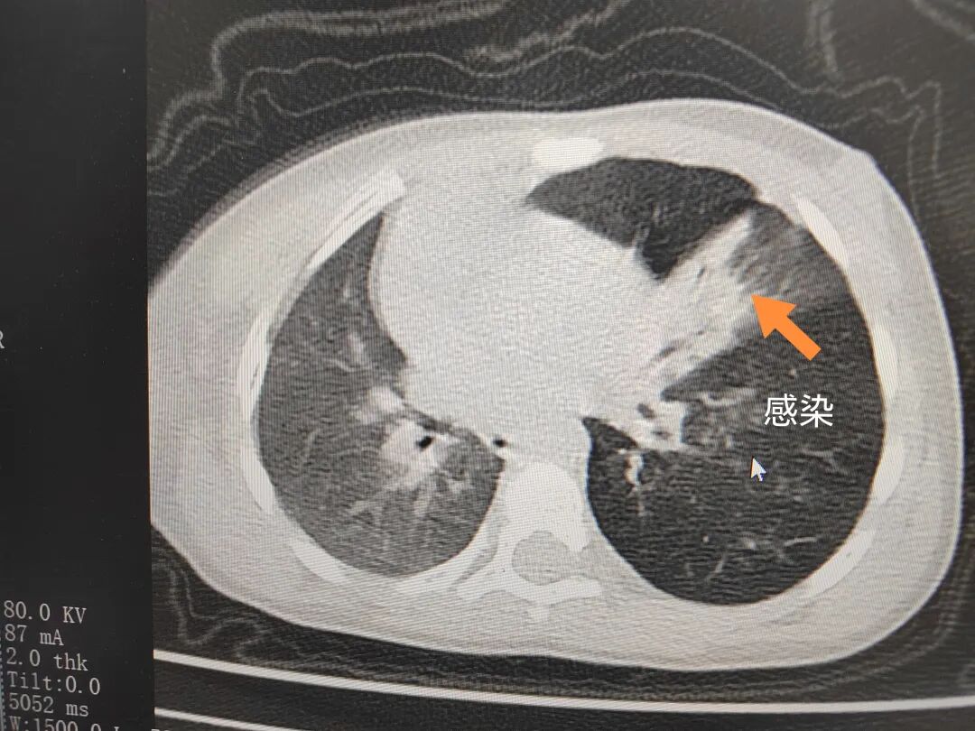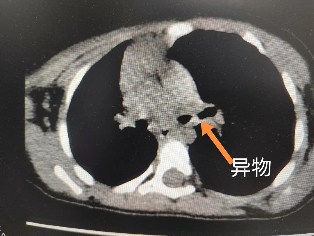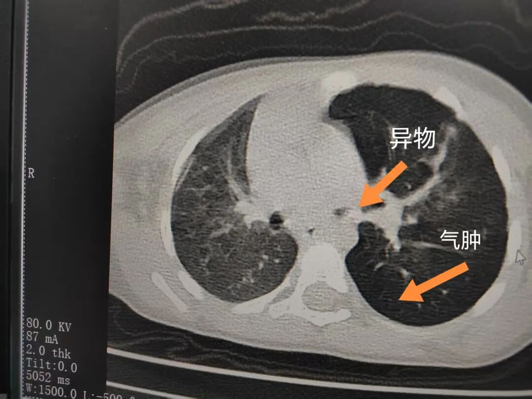 三天后(11月13日),趙寶出現(xiàn)高熱、咳喘加重,家長著急了,再次帶他來到醫(yī)院。CT檢查顯示左肺過度充氣,左肺上下葉支氣管主干見不規(guī)則高密度影,左肺上葉可見大片狀密度增高影,縱隔窗實變,提示為“左側(cè)支氣管內(nèi)異物并繼發(fā)性改變,左肺上葉舌段肺膨脹不全”。