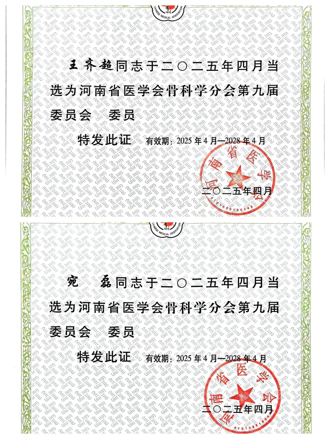 院長王齊超、智能微創(chuàng)骨科主任宛磊分別當選為河南省醫(yī)學會骨科學分會第九屆委員會委員。