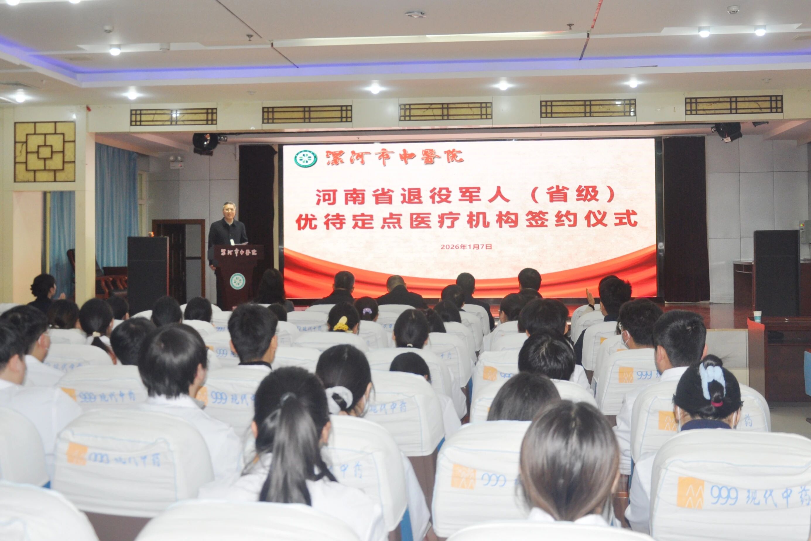 2026年1月7日,“河南省退役軍人(省級)優(yōu)待定點醫(yī)療機構”簽約儀式在漯河市中醫(yī)院舉行。河南省退役軍人事務廳擁軍優(yōu)撫和褒揚紀念處處長劉克非,擁軍優(yōu)撫和褒揚紀念處二級調(diào)研員尤東坡,漯河市衛(wèi)健委黨組副書記、副主任宋孟剛,漯河市中醫(yī)院黨委書記、院長楊軼,副院長閆丙川等出席簽約儀式。簽約儀式由漯河市退役軍人事務局黨組成員、副局長趙耀華主持。