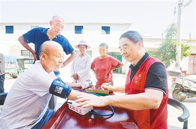 趙國鎖為居民測量血壓(資料圖片)。記者 楊 光 攝