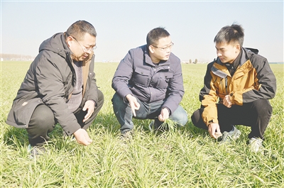 王靈光(中)和團(tuán)隊成員察看小麥苗情。