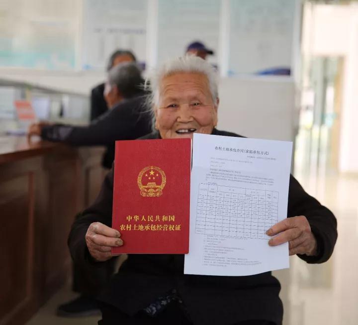 △2017年4月5日,江蘇省海安縣南莫鎮(zhèn)唐莊村1組村民丁桂英喜領《農村土地承包經營權證》。
