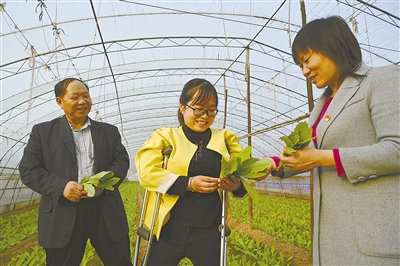 胡會(huì)玲(中)在自家大棚里看著長(zhǎng)勢(shì)良好的蔬菜,喜悅之情溢于言表。