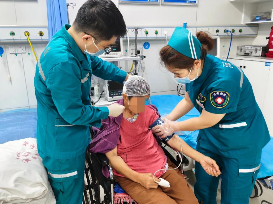 7月16日,大雨不停歇,該院急診科全天出車近20次。有的路段水深難行,醫(yī)務(wù)人員淌水到病人家中,第一時(shí)間為患者診治。在急診室內(nèi),急診醫(yī)生為外傷患者包扎傷口后詢問患者情況,護(hù)士長(zhǎng)段銳為患者測(cè)量生命體征。