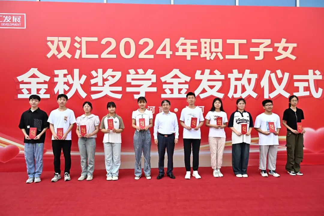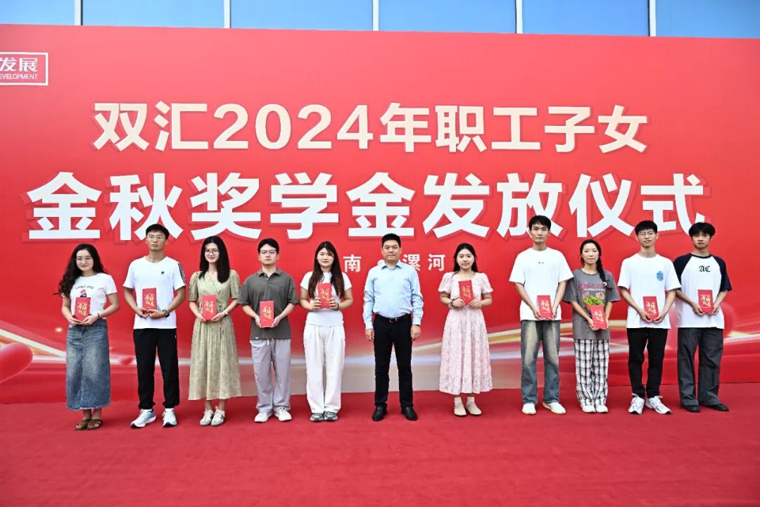 雙匯發(fā)展副總裁周霄為學生代表發(fā)放獎學金并合影留念活動現(xiàn)場,雙匯發(fā)展總裁馬相杰,黨委書記、工會主席杜俊甫,副總裁周霄為學生代表發(fā)放獎學金并合影留念。其他職工子女現(xiàn)場領取獎學金。