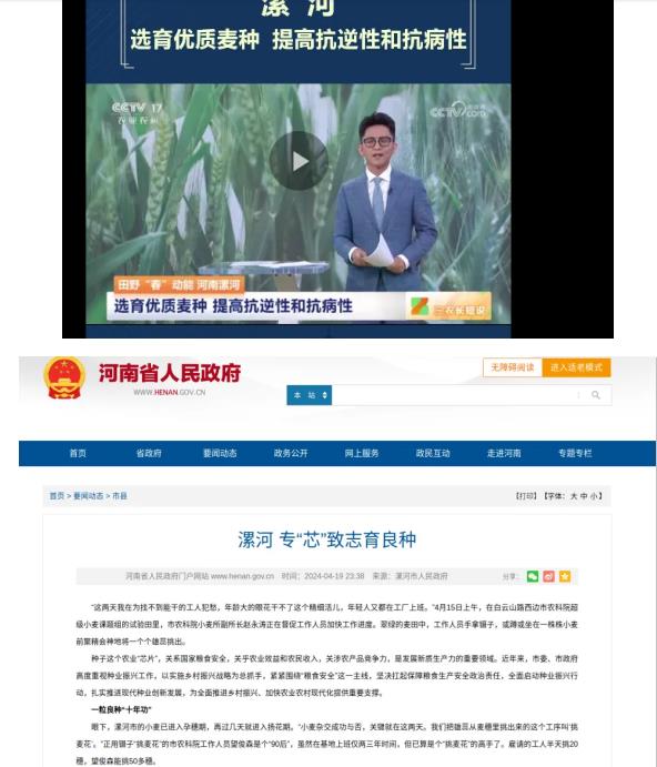 2024年,在市級(jí)以上媒體宣傳報(bào)道90余篇?!秾?ldquo;芯”致志育良種》被省政府官網(wǎng)報(bào)道,科技服務(wù)春耕春管工作被《河南日報(bào)》《科技日報(bào)》報(bào)道,《選育優(yōu)質(zhì)麥種提高抗逆性和抗病性》小麥新品種選育工作4月26日被央視報(bào)道。