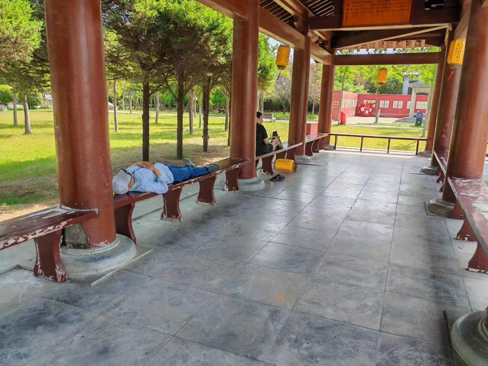 五一期間,許慎文化園,游客躺在長(zhǎng)椅上