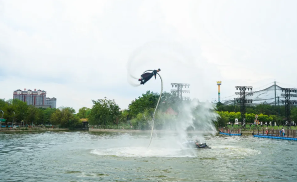 水上表演更是精彩絕倫?!丢?dú)竹水上漂》節(jié)目中,表演者們腳踩楠竹,在水面上輕盈滑行,仿佛在水上飛舞,引得觀眾們驚嘆不已。《水上飛人》的表演者們借助噴水裝置在空中翻轉(zhuǎn)騰挪,如同超人般翱翔于水面之上;而《水上火壺》則將傳統(tǒng)藝術(shù)與現(xiàn)代科技完美結(jié)合,火光與水花交相輝映,震撼的視覺效果讓觀眾們?nèi)滩蛔“l(fā)出陣陣喝彩和尖叫。鳳棲湖劇場(chǎng)內(nèi),大型舞臺(tái)劇《時(shí)空奇緣》的現(xiàn)場(chǎng)排練預(yù)演同樣精彩,演員們精湛的表演和動(dòng)人的故事引得觀眾掌聲雷動(dòng),沉浸其中。