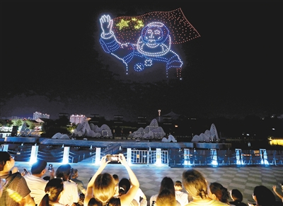 8月21日晚8時許,千架無人機在河上街景區(qū)騰空而起,瞬間點亮夜空?;鸺?、身著航天服在太空漫步的宇航員、繞地球飛行的天宮空間站……當晚的千機飛“只有漯河”展演活動,以“太空之旅”為主題,吸引了眾多市民和游客。記者看到,市民、游客紛紛舉起手機、相機,定格精彩瞬間(如圖)。