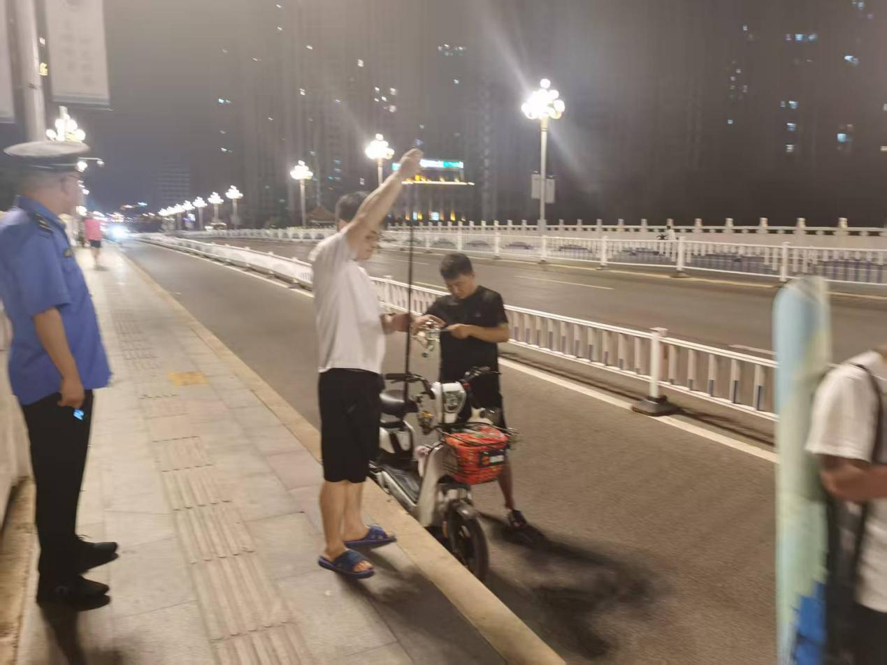 “晚上橋面光線不好,來(lái)回過(guò)往的行人和非機(jī)動(dòng)車(chē)輛也多,您在這兒垂釣實(shí)在是不安全啊,趕快收竿回家吧。”8月3日20時(shí)許,在漯河市金山路沙河橋上,經(jīng)開(kāi)區(qū)城市管理綜合行政執(zhí)法大隊(duì)大隊(duì)長(zhǎng)曹陽(yáng)帶領(lǐng)夜間執(zhí)法人員在轄區(qū)范圍內(nèi)開(kāi)展橋面垂釣治理行動(dòng)。