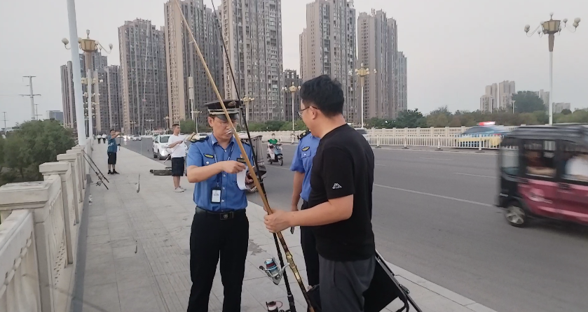 城管隊(duì)員對(duì)占用橋面違規(guī)釣魚(yú)者進(jìn)行處罰