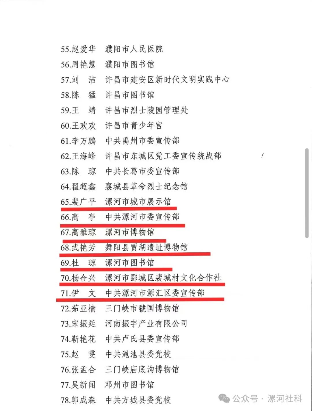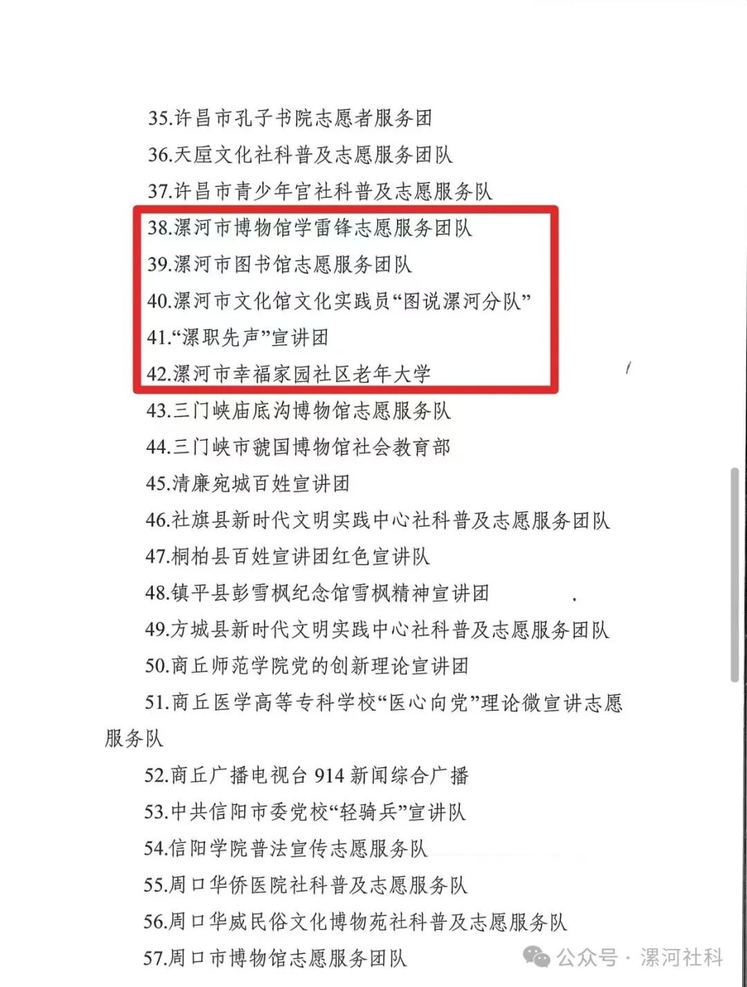 2024年社科普及志愿服務(wù)活動(dòng)表現(xiàn)突出社科普及志愿服務(wù)團(tuán)隊(duì)(5個(gè)):漯河市博物館學(xué)雷鋒志愿服務(wù)團(tuán)隊(duì);漯河市圖書館志愿服務(wù)團(tuán)隊(duì);漯河市文化館文化實(shí)踐員“圖說漯河分隊(duì)”;“漯職先聲”宣講團(tuán);漯河市幸福家園社區(qū)老年大學(xué)