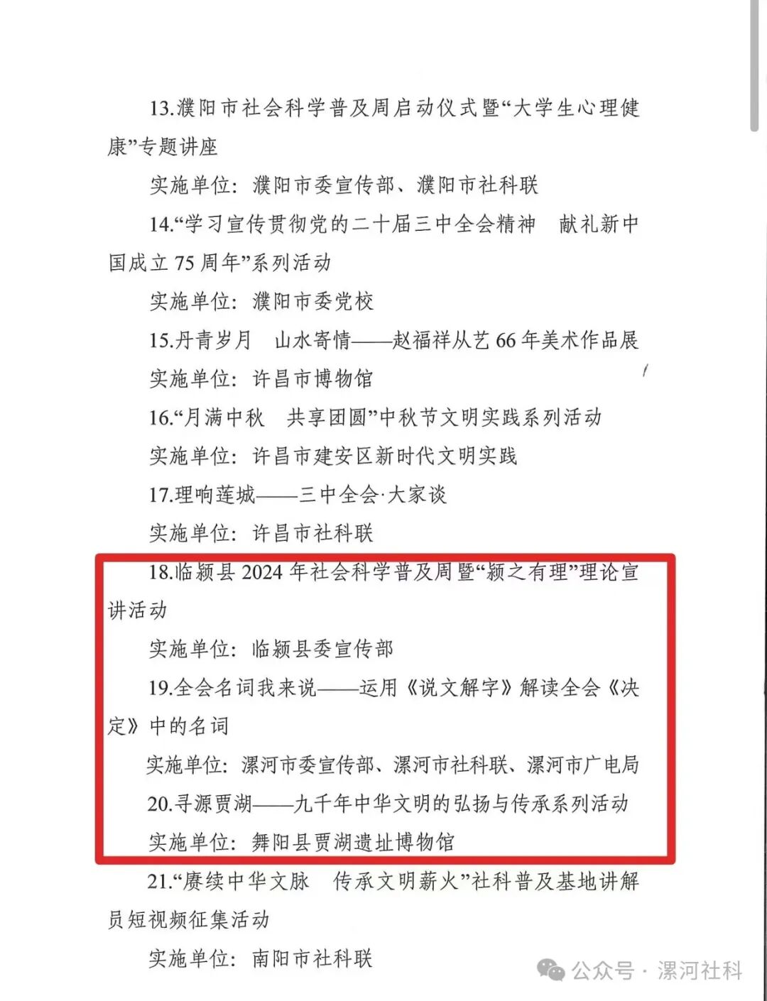 2024年河南省社科普及周活動(dòng)表現(xiàn)突出特色活動(dòng)(3個(gè)):臨潁縣2024年社會(huì)科學(xué)普及周暨“潁之有理”理論宣講活動(dòng)(實(shí)施單位:臨潁縣委宣傳部);全會(huì)名詞我來說——運(yùn)用《說文解字》解讀全會(huì)《決定》中的名詞(實(shí)施單位:漯河市委宣傳部、漯河市社科聯(lián)、漯河市廣電局);尋源賈湖——九千年中華文明的弘揚(yáng)與傳承系列活動(dòng)(實(shí)施單位:舞陽(yáng)縣賈湖遺址博物館)