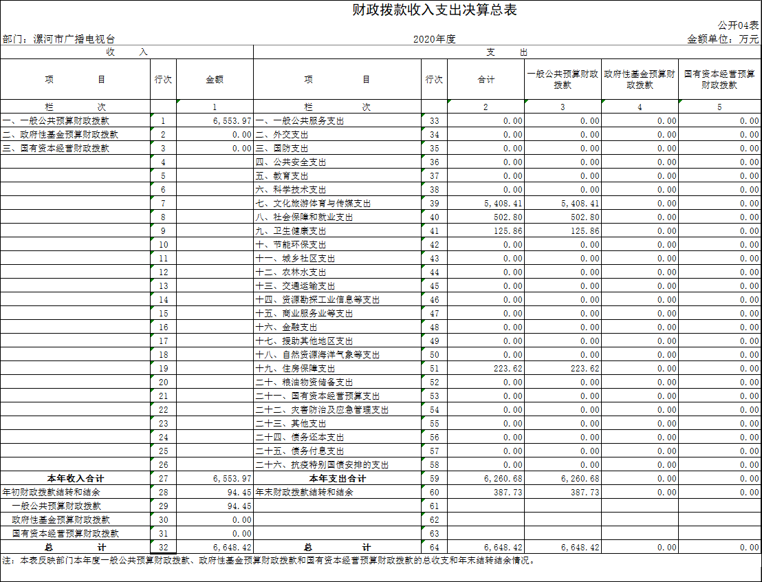 2020年度財政撥款收、支總計均為6648.42萬元。與上年度相比,財政撥款收、支總計各減少997.73萬元,下降13.05%。主要原因是廣告收入下降;機(jī)構(gòu)改革,人員減少。