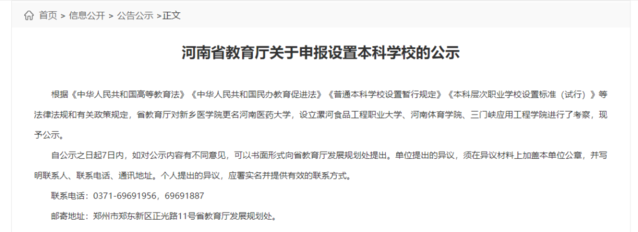 剛剛,河南省教育廳發(fā)布關(guān)于申報設置本科學校的公示,其中提到,省教育廳對