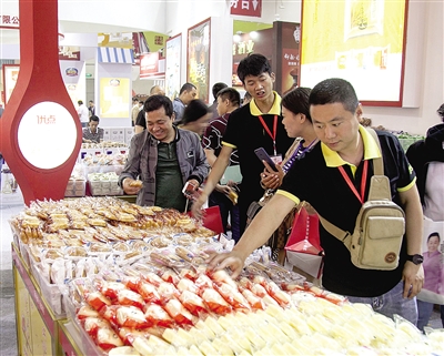 在場館內(nèi)的A區(qū)入口處,一個帶有濃濃中國風的展位吸引了記者的目光。隨著一個個火紅的繡球望去,原來是“金老大老月餅”的展館。記者一進入展館好像時光就拉回到中秋佳節(jié)。展館正中央,有一個直徑50厘米的大月餅,引來不少人圍觀。“這個月餅是我們這里最大的,可以根據(jù)顧客需要定制。想吃牛肉味的我們就做成牛肉味的,想吃五仁的就做成五仁的,只要顧客想得到,我們都可以做。”工作人員對記者介紹。