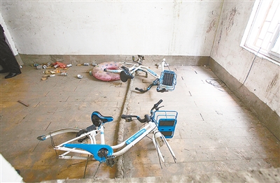 12月21日中午,記者來到市區(qū)漢江路與太行山路交叉口東北角的一處城中村,見三輛共享單車所在的民房垃圾遍地,一床破舊的鋪蓋堆放在一個(gè)房間里。被拆解的兩輛共享單車,在二樓的一個(gè)房間內(nèi),車輪不見了,車鎖也被破壞。