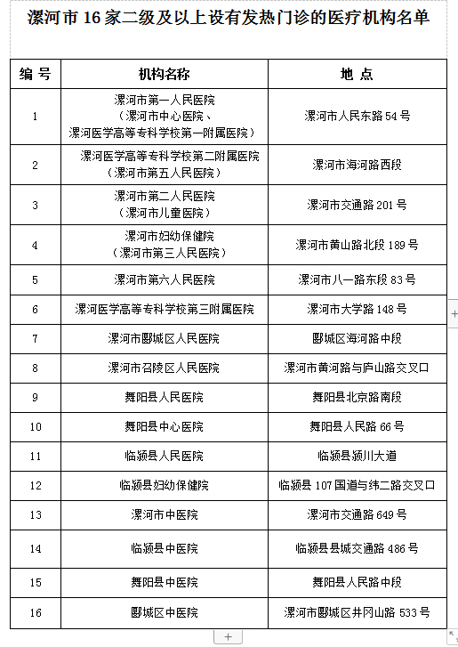 根據(jù)河南省衛(wèi)生健康委發(fā)布《關(guān)于印發(fā)河南省新型冠狀病毒感染的肺炎醫(yī)療救治定點(diǎn)醫(yī)院名單的通知》豫衛(wèi)醫(yī)函〔2020〕2號文件要求,全省公布了130所新型冠狀病毒感染的肺炎醫(yī)療救治定點(diǎn)醫(yī)院名單,漯河市共三家醫(yī)院,請廣大市民敬請關(guān)注并相互提醒,現(xiàn)公布如下:漯河市中心醫(yī)院(漯河市第一人民醫(yī)院)、臨穎縣人民醫(yī)院、舞陽縣人民醫(yī)院;漯河市傳染病醫(yī)院(救治準(zhǔn)備醫(yī)院)。