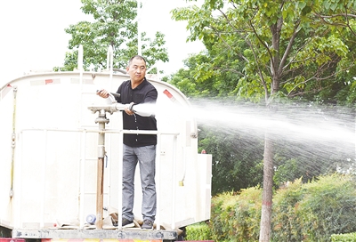 “使用這種高壓水槍要順著一個方向一點一點沖洗,不要這里沖一下那里沖一下。”看到環(huán)衛(wèi)工人正在路上沖洗清掃,楊躍偉耐心地向他們講解高壓水槍的使用方法和技巧。