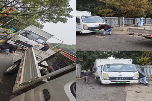 在市區(qū)駐點的劉照明同志在接到消息后,第一時間組織人手奔赴現(xiàn)場。一線員工在現(xiàn)場見到焦急等待的張師傅,告訴張師傅:“不要慌張。”然后駕駛公司的應(yīng)急通訊車把貨車拖到了市區(qū)駐點,幫其解除了困境,避免了貨車司機的重大損失。