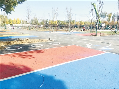 這里的建筑拆除后,已經(jīng)修建了停車場(chǎng)、小公園和道路。停車場(chǎng)有近50個(gè)車位,分別涂上了紅、黃、藍(lán)、綠等不同的顏色,每隔幾個(gè)車位有樹木和草坪。各種指示箭頭、標(biāo)識(shí)也施劃完畢。