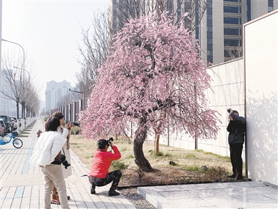 3月14日,在市區(qū)王屋山路蘇荷象灣壹號(hào)小區(qū)門(mén)前,兩株盛開(kāi)的龍梅形成兩團(tuán)巨大的粉色花簇,吸引不少市民圍觀(guān)拍照。