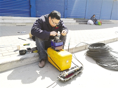 “可能是有大車經(jīng)過掛住線纜,導(dǎo)致線纜被拉長,最終垂落地上。”陳師傅邊熔纖,邊告訴記者。