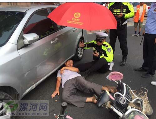 漯河市交警支隊(duì)秩序管理示范大隊(duì)騎警吳沛洋:當(dāng)時(shí)我跟隊(duì)友王冰潔巡邏到嵩山西支路的時(shí)候,發(fā)現(xiàn)一場(chǎng)車禍,我們立即上去查看,當(dāng)時(shí)發(fā)現(xiàn)地上躺了一位六十多歲的老人,經(jīng)過(guò)簡(jiǎn)單的詢問(wèn)老人出現(xiàn)了頭暈,胸悶的癥狀,根據(jù)經(jīng)驗(yàn)確定他有可能是心臟病,因?yàn)楫?dāng)時(shí)天氣溫度較高, 地表溫度可能要達(dá)到四十多度,老人心臟病不能移動(dòng),只能平躺,我就把老人的頭稍微抬起來(lái)一點(diǎn),由于沒(méi)有支撐點(diǎn),情急之下我就坐在地上伸出腿,讓老人枕著我的腿,等待120的救援。