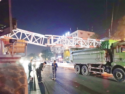 不一會(huì)兒,救援人員趕到現(xiàn)場,在限高桿附近擺放警示標(biāo)志,提醒過往車輛和行人小心。隨后,救援人員找來一輛挖掘機(jī),把鏟斗升起,托著搖搖欲墜的限高桿,防止其墜落。然后,救援人員對限高桿進(jìn)行修復(fù)。