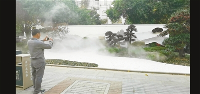 走近美景,記者看到了錯落有致的假山、精心布局的綠植、小石子鋪成的石徑,以及不斷噴發(fā)出的水霧,真是一道美麗的風(fēng)景。
