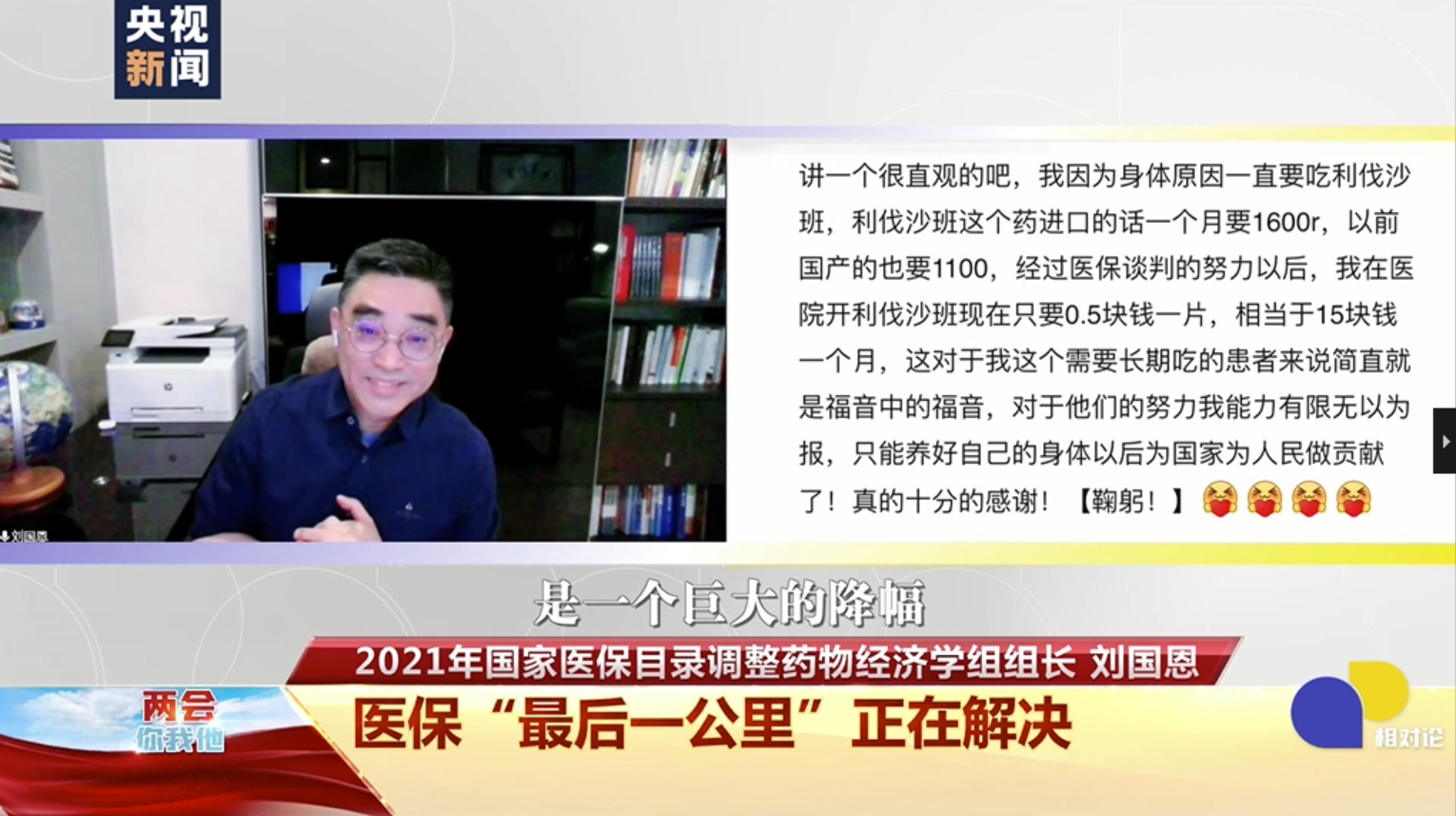 劉國恩:看到這些評論,肯定是非常欣慰的,非常非常欣慰。國家醫(yī)保局成立以來,在醫(yī)保目錄準入談判、藥品集中帶量采購等方面做了很多工作,確實大大減輕了患者的經濟負擔。與此同時,從長遠來看的話,國家支付能力、個人支付能力,不斷提高才是根本。說一千道一萬,最根本還是如何把我們中國的經濟,更好地、持續(xù)地、穩(wěn)定地,推向越來越好的增長水平。