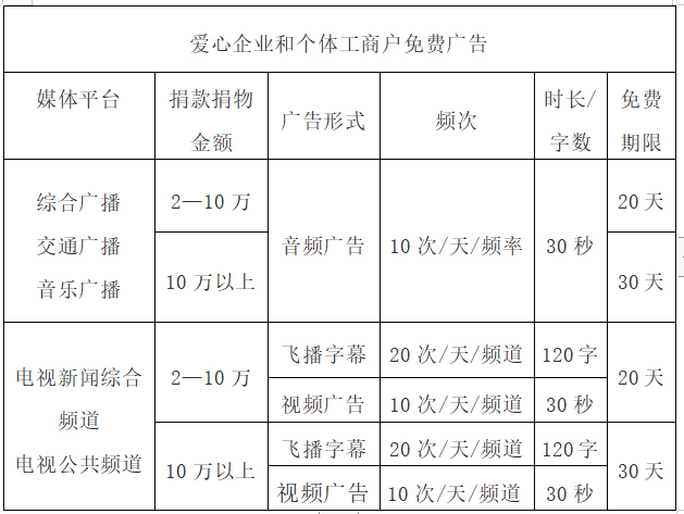 1、服務(wù)對象:在疫情防控期間,凡向我市防疫一線捐款捐物的企業(yè)、個體工商戶(包括本地和外地企業(yè)),均可享受免費廣告服務(wù)。