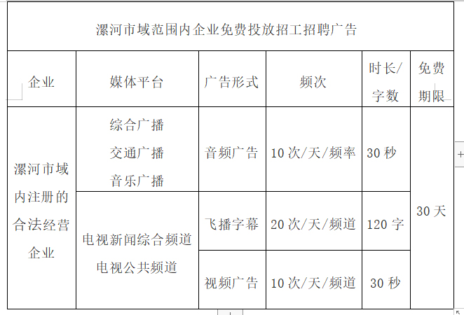 一、漯河市域范圍內(nèi)企業(yè)免費投放招工招聘廣告