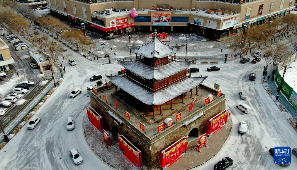 2月21日在甘肅省酒泉市拍攝的雪后鐘鼓樓(無人機照片)。