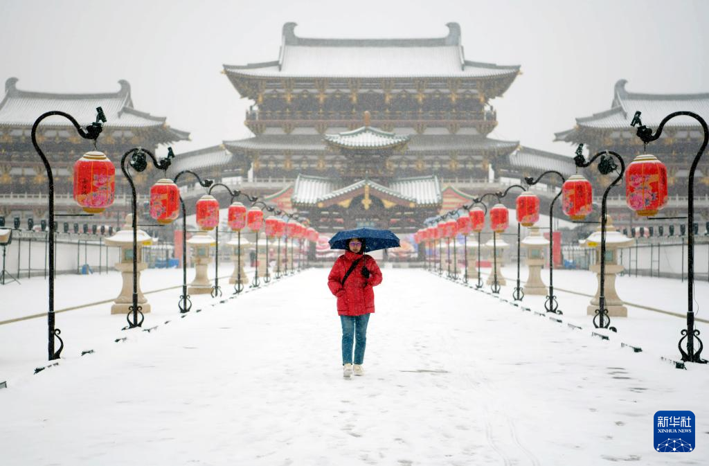 2月21日,游客在河南省洛陽市隋唐洛陽城九洲池景區(qū)內(nèi)踏雪游覽。