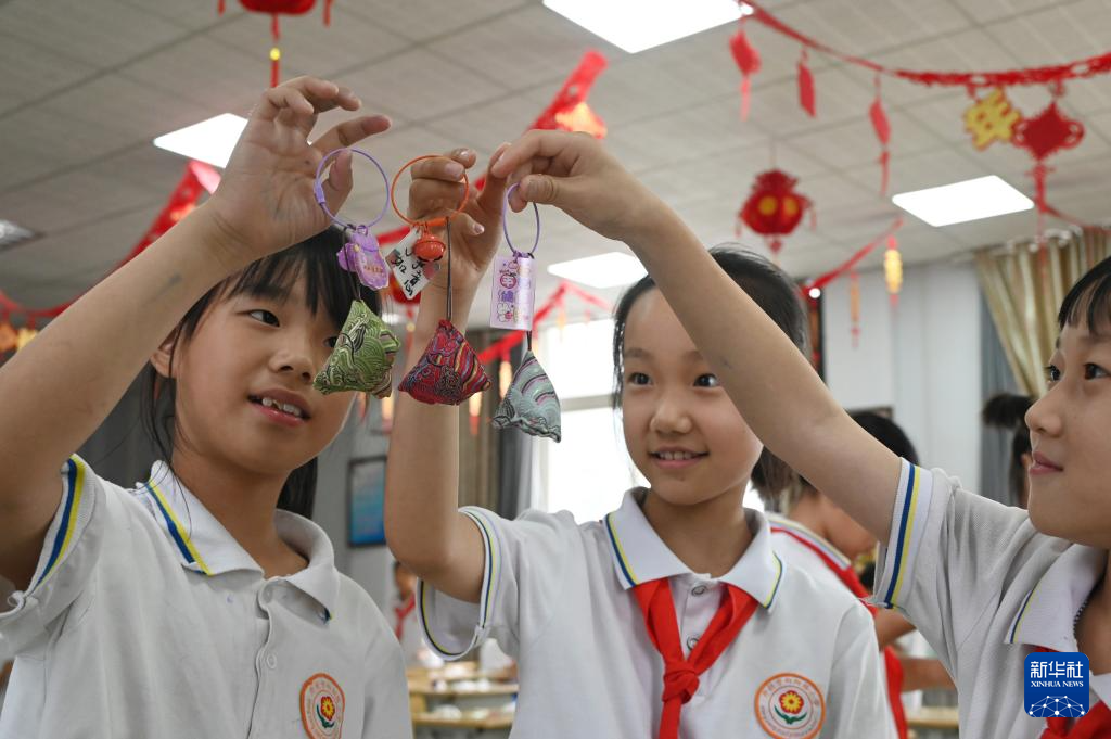 6月5日,河南省開封市向陽(yáng)路小學(xué)的學(xué)生展示自己制作的香囊。