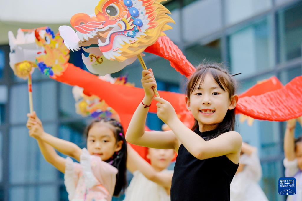 6月5日,河南省濟(jì)源市第一幼兒園的小朋友在體驗(yàn)舞龍。