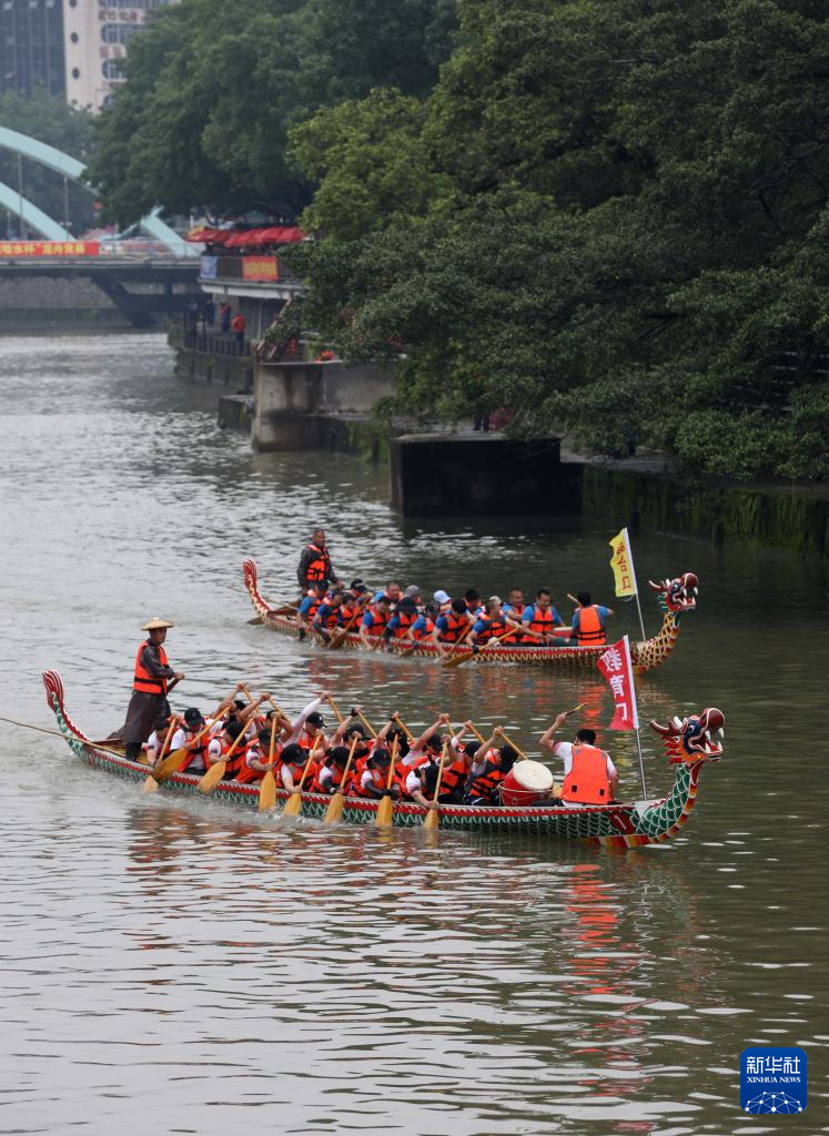 6月5日,龍舟隊(duì)員在福建省龍巖市龍津河參加龍舟競(jìng)渡。