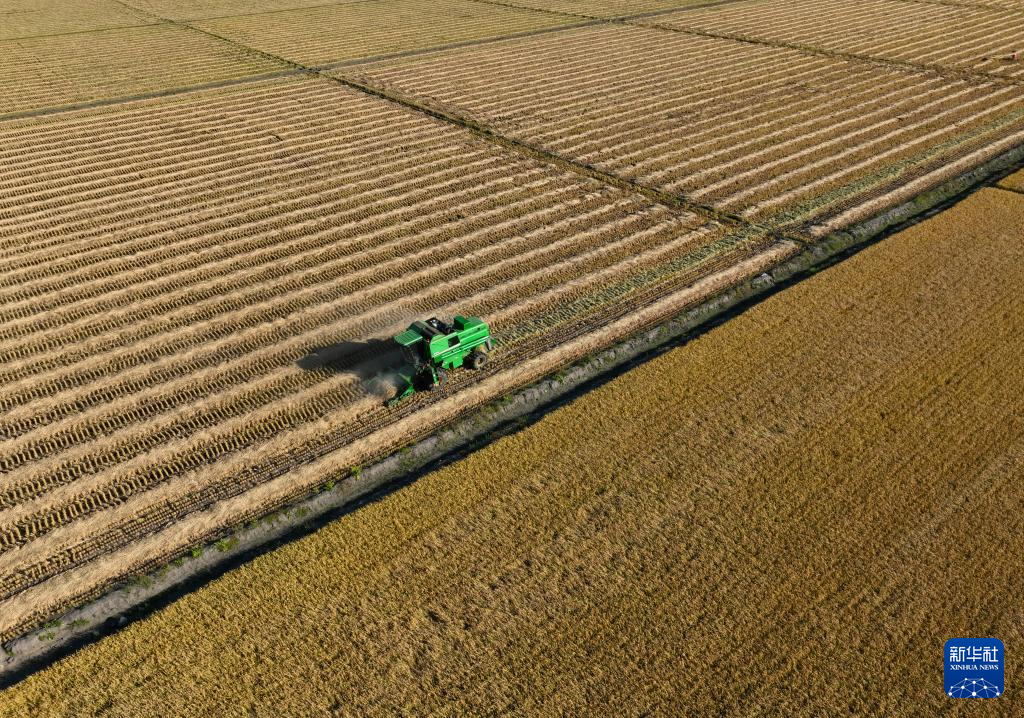 10月3日,在北大荒集團黑龍江七星農(nóng)場有限公司水稻地塊,收割機在進行收獲后的拾禾作業(yè)(無人機照片)。