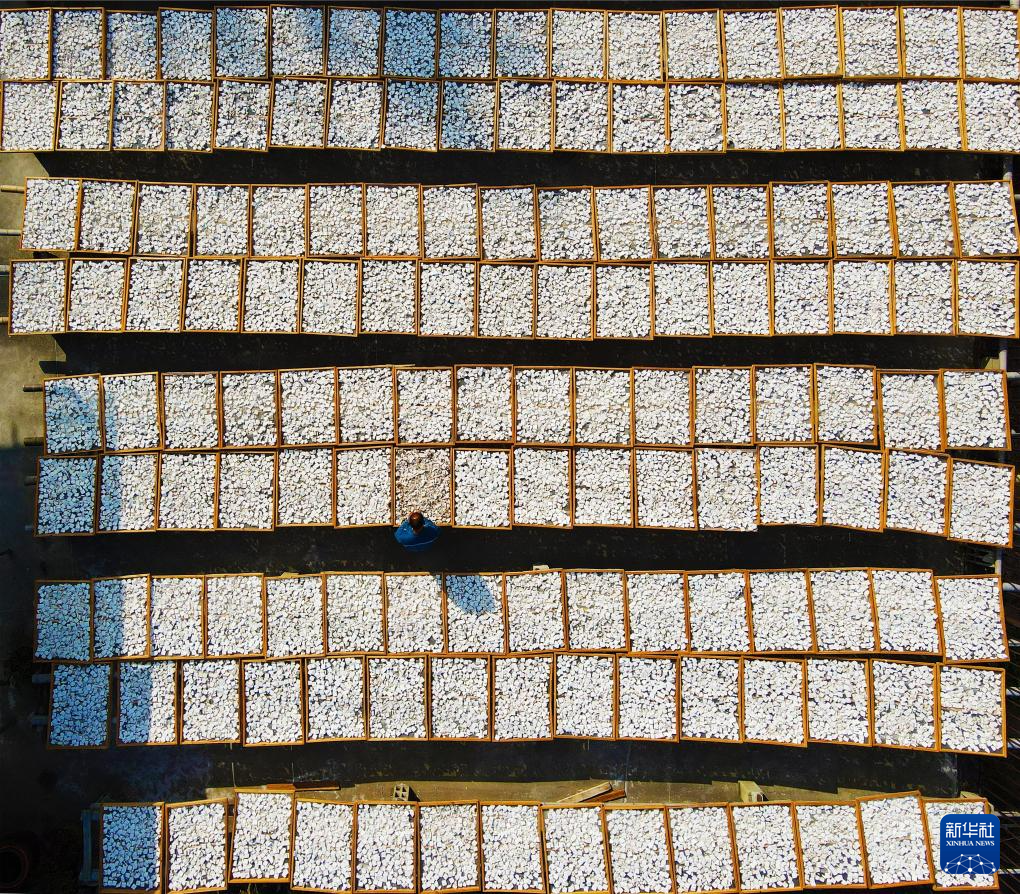 10月4日,在安徽省安慶市岳西縣響腸鎮(zhèn)千佛塔村,村民在曬茯苓(無人機照片)。