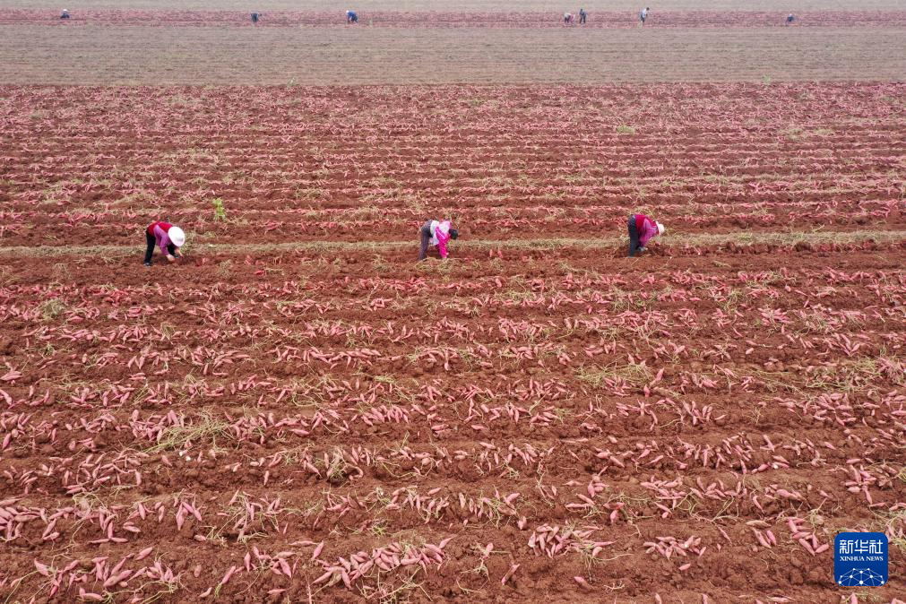 10月30日,在河南省沁陽(yáng)市王曲鄉(xiāng)東王曲村一家庭農(nóng)場(chǎng),農(nóng)民在田間收獲紅薯(無(wú)人機(jī)照片)。