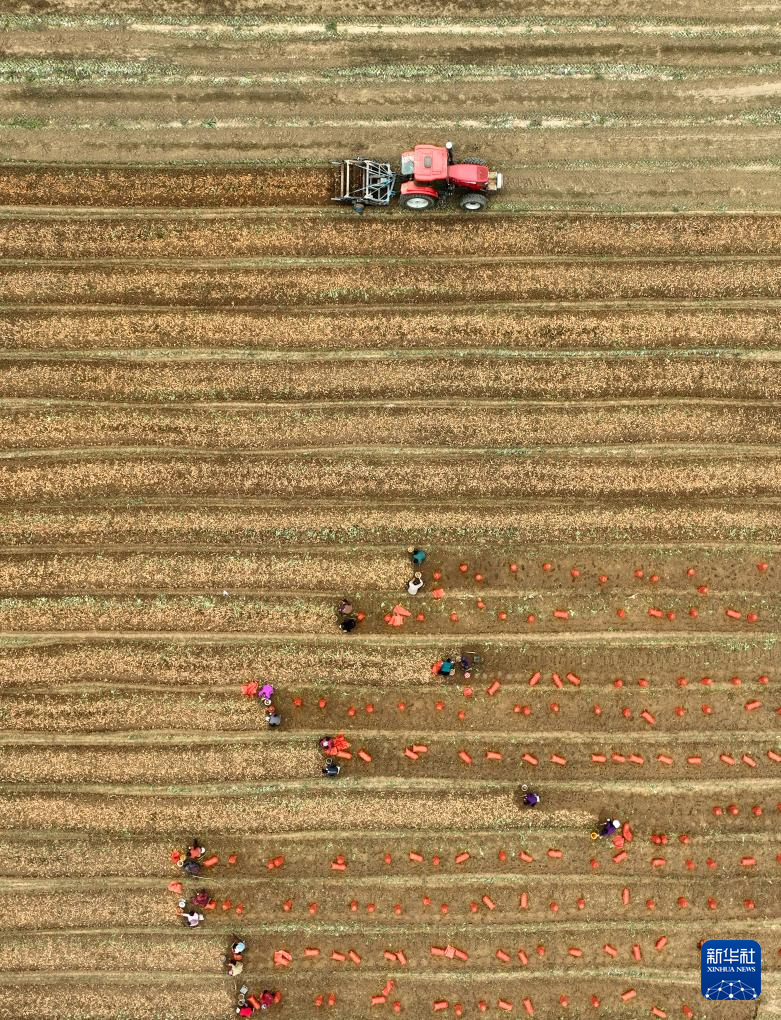 10月30日,在河北省石家莊市元氏縣殷村鎮(zhèn)殷村中藥材種植田,農(nóng)民們忙著采收地黃(無(wú)人機(jī)照片)。