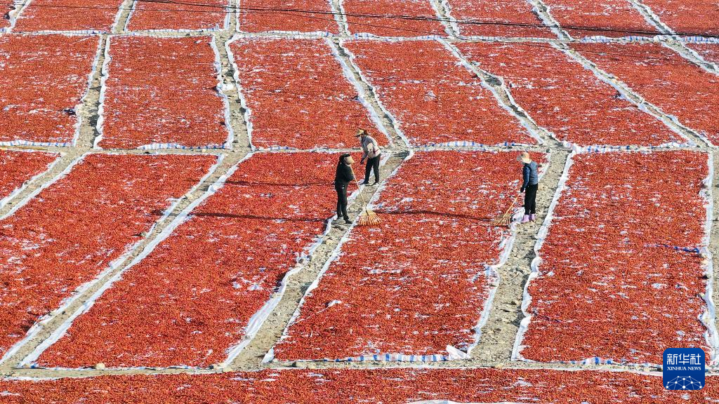10月30日,農(nóng)民在河北省遵化市一家專業(yè)合作社的曬場(chǎng)晾曬山楂干(無(wú)人機(jī)照片)。