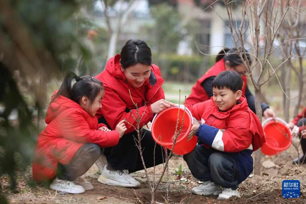3月11日,小學(xué)生在河南省商丘市夏邑縣育才學(xué)校教育實(shí)踐基地參加義務(wù)植樹(shù)護(hù)樹(shù)活動(dòng)。
