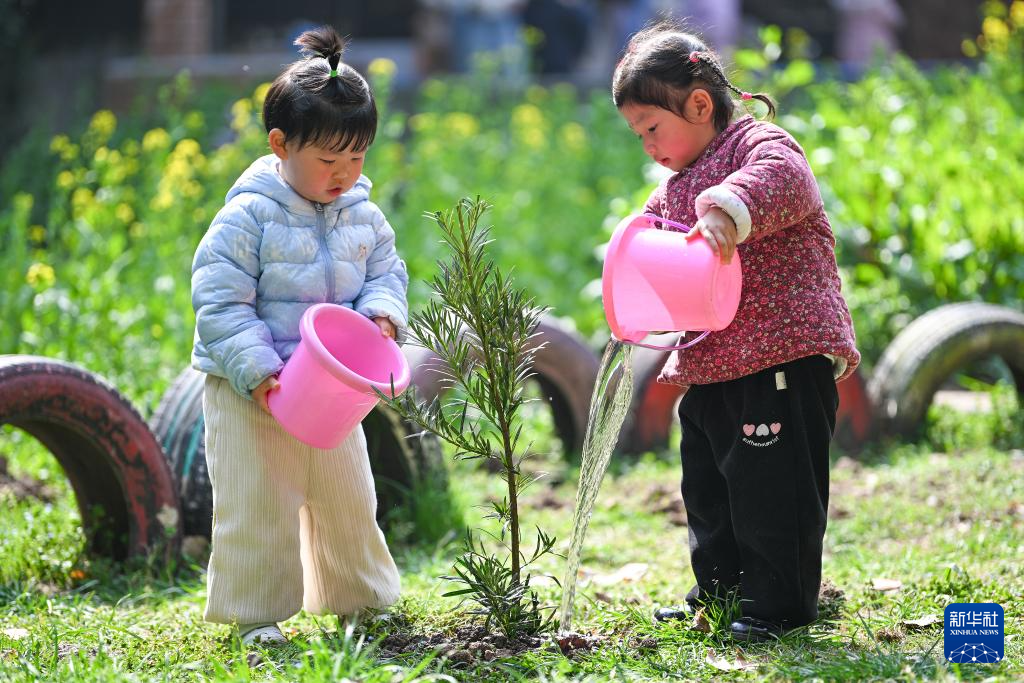 3月11日,江蘇省南京市建鄴區(qū)金地名京幼兒園的孩子們?cè)谛@里為樹(shù)苗澆水。