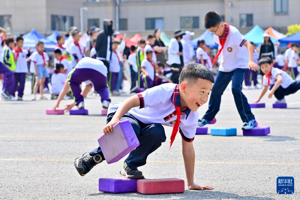 5月30日,在遼寧省鞍山市岫巖滿族自治縣實驗小學,學生在趣味運動會上進行“移石過河”游戲。