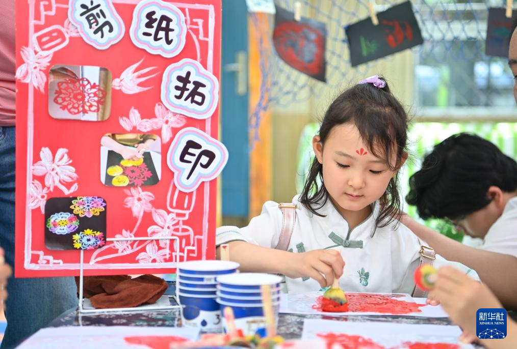 5月30日,山西省太原市迎澤區(qū)師苑幼兒園的小朋友在慶祝“六一”主題活動中體驗剪紙拓印。
