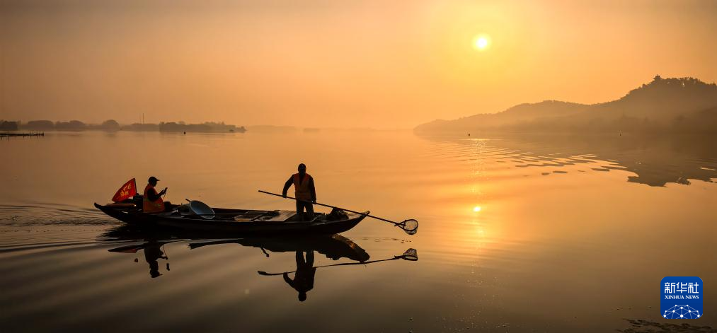 11月16日,工作人員在武漢市東湖風(fēng)景區(qū)進(jìn)行清漂作業(yè)。